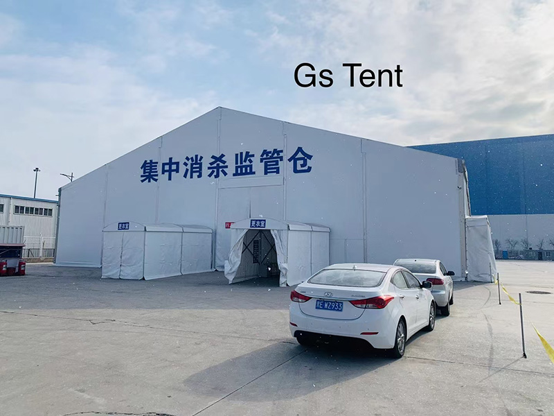 在本次大連冷鏈疫情中,高山篷房提供的2400平的裝配式物流倉儲篷房、22座推拉篷房和6座更衣室篷房已正式投入使用。在抗擊疫情這種緊急時刻,去臨時修建傳統固定倉庫,時間上是不允許的,因此搭建快速、結構安全的裝配式篷房就派上了用場。