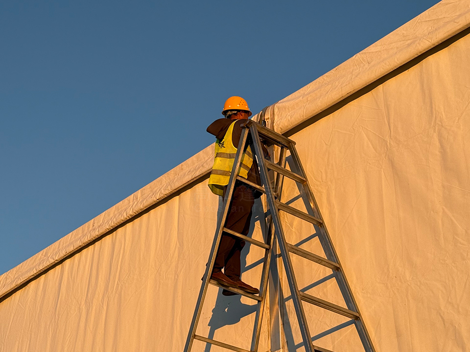 工人們的身影在光影里忙碌著,汗水混著霞光,每一寸搭建都格外扎實(shí)。從晨光微亮到暮色四合,他們沒(méi)錯(cuò)過(guò)長(zhǎng)春每一縷醉人的夕陽(yáng),也沒(méi)怠慢篷房的每一根梁架、每一處銜接——為了給長(zhǎng)春航展搭起穩(wěn)妥的“家”,他們把艱辛與執(zhí)著,都揉進(jìn)了這潔白的建筑里。