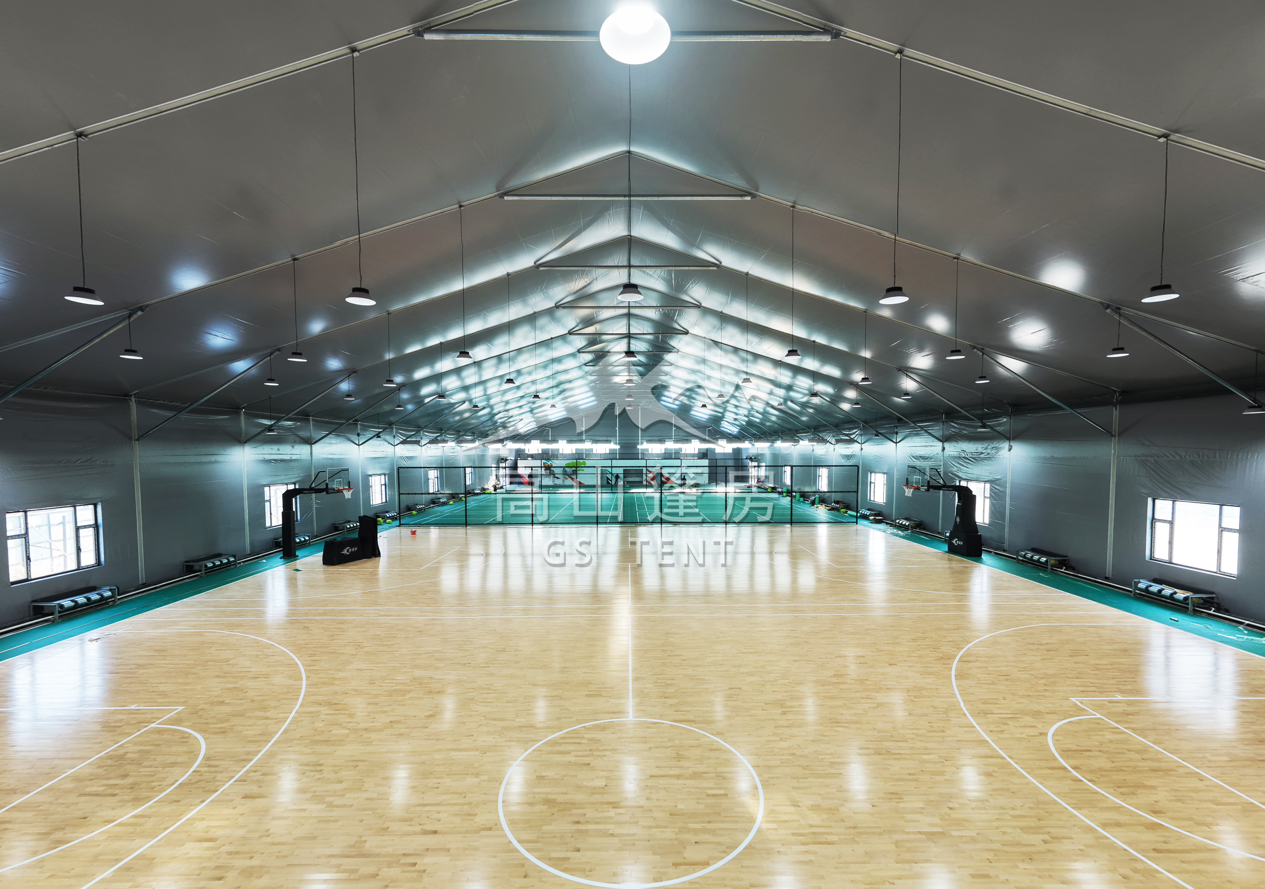 篷房體育館內部無立柱設計,實現了空間的最大化利用。跨度可達50米,邊高可達10米,長度可按需求延伸,創(chuàng)造出開闊完整的運動空間。無論是籃球、羽毛球、網球還是大型健身活動,都能在這里得到完美滿足。同時,篷房提供多種造型選擇,如人字形、桃形、球形等,既美觀又實用。