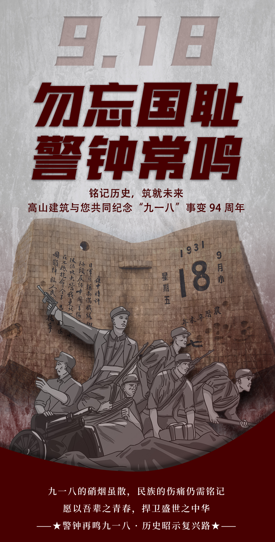 九十四年風(fēng)雨滄桑,“九一八”的警鐘依然長(zhǎng)鳴。這一天,是中華民族刻骨銘心的痛楚,也是激勵(lì)我們自強(qiáng)不息、奮發(fā)圖強(qiáng)的精神源泉。高山篷房建筑科技(遼寧)有限公司在此莊嚴(yán)時(shí)刻,與全國(guó)人民一同緬懷歷史、致敬英烈,勿忘國(guó)恥,珍愛和平。